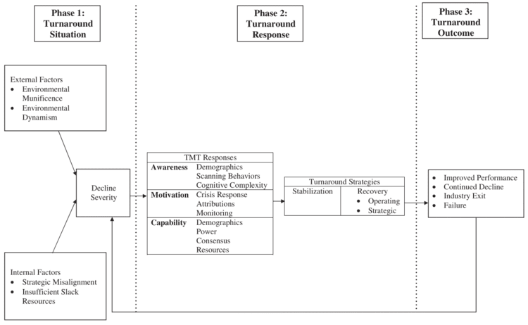 Before then in 2004, researchers Franz T. Lohrke, A. Bedeian, Timothy B. Palmer wrote the phases as 1) Turnaround Situation, 2) Turnaround Response and 3) Turnaround Outcome, as described in the image below from their “The Role of Top Management Teams in Formulating and Implementing Turnaround Strategies: A Review and Research Agenda” article published in the October edition of International Journal of Management Reviews.